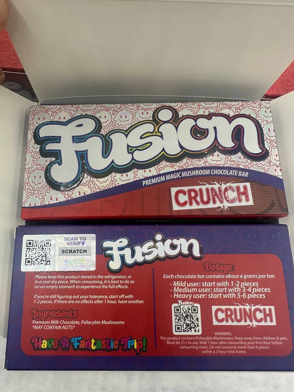 Kap’n Krunch Fusion Bar The fusion packaging is quite simple yet sleek with our Fusion logo right at the center of the bar. The name of the flavor can be seen at the bottom right of the bar, the back of the shroom chocolate bar has information about dosing and the unique qr code that can be used to verify the bar.