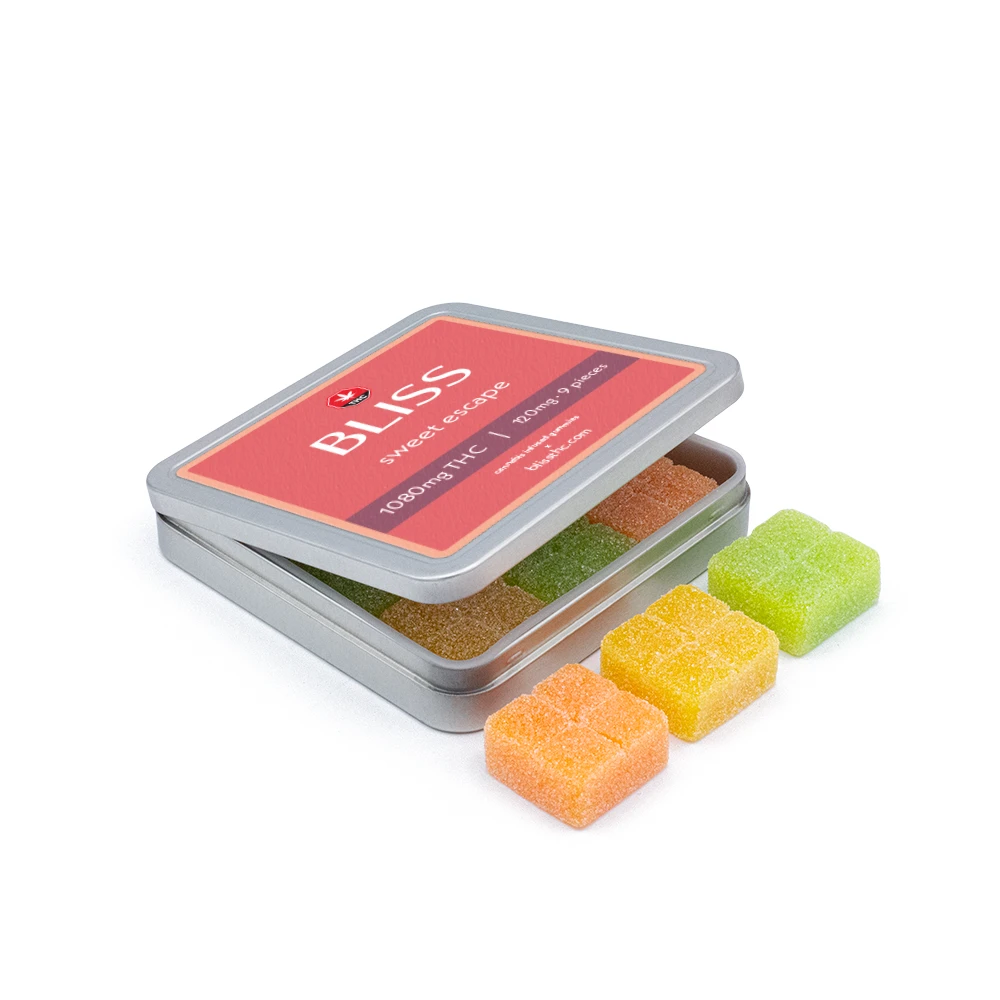 Sweet Escape (1080mg THC) gummies by Bliss are a premium edible product crafted for cannabis enthusiasts who seek a flavorful and potent experience. These gummies are expertly infused with high-quality THC distillate, offering a reliable and consistent dose in every bite. Perfectly balanced to provide relaxation, euphoria, and mental clarity, Sweet Escape is designed to elevate your day while indulging your taste buds.